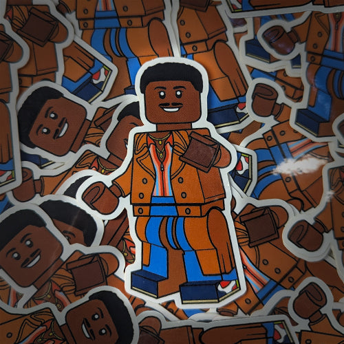 Glossy super cool sticker based on my custom Dr How? minifigure design for the 15th Doctor!