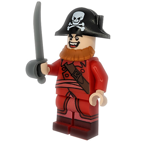 The Ghostly Pirate has a full 360 degree design, including a double-sided torso and legs with side printing. He's got his pirate Bicorne hat, his bushy red beard and of course, a cutlass sword as an accessory.